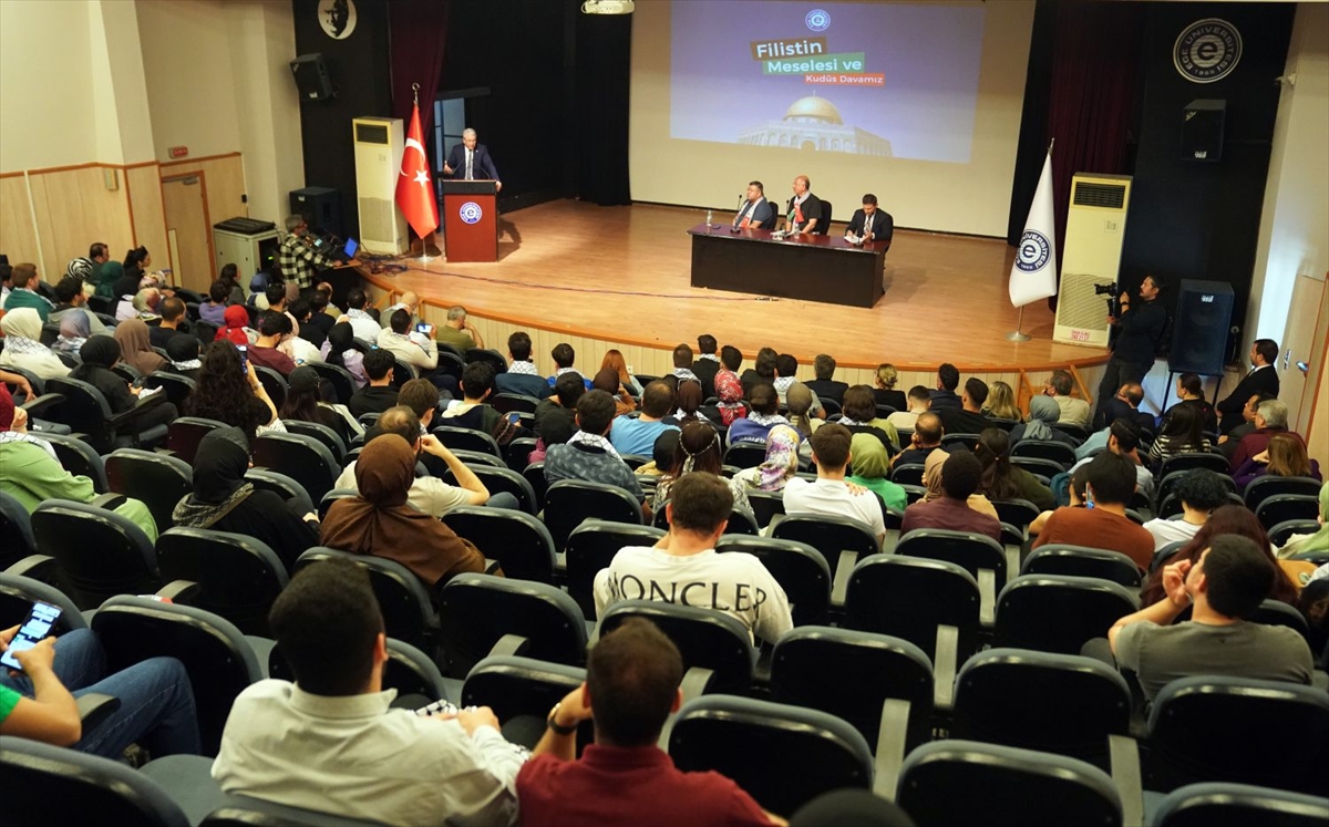 EÜ Kültür Sanat Evi’nde gerçekleşen konferansta konuşan Rektör Prof. Dr. Necdet Budak, Filistin’de yaşananların insani felaket olduğunu söyledi.