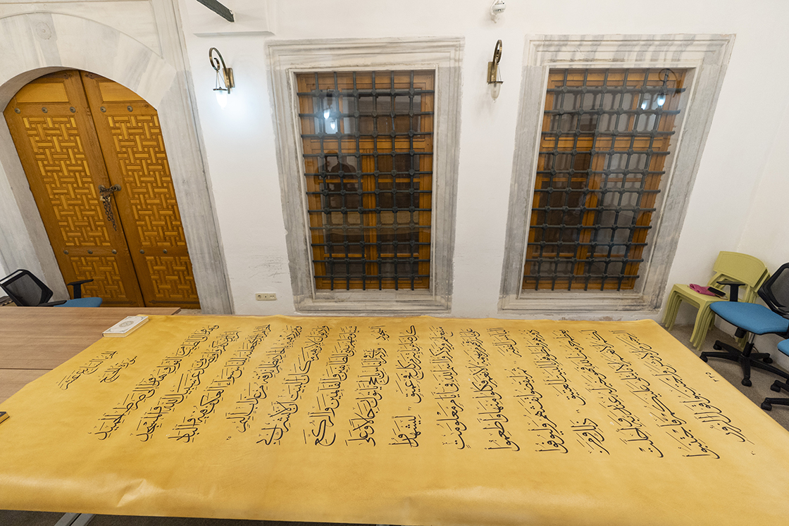 Her biri 4 metre uzunluğunda ve 1,5 metre genişliğinde olan, açıldığında 3 metreyi bulan sayfalardan oluşan Mushaf’ı yazarken modern araçlardan tamamen uzak duran Zaman, her bir harfi geleneksel kamış ve tomar kalemlerle sülüs hattına uygun işledi.